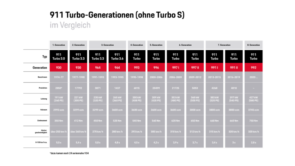 Das wichtigste Erfolgsgeheimnis eines Turbo-Modells aus Zuffenhausen ist seit jeher die technische Evolution. So freut es Porsche-Enthusiasten sehr, aber überrascht sie wenig, dass der aktuelle 911 Turbo (911 Turbo (Vorgängermodell)) der Elfer-Generation 992 die magische Grenze von drei Sekunden beim Sprint auf hundert um 0,2 Sekunden unterbietet. Wie all seine Vorgänger tritt auch der 427 kW (580 PS) starke Turbo ab 2020 ein großes Erbe an. Jede Generation vor ihm schrieb den Ruf als weltweite Referenz für Hochleistungssportwagen fort. Die jüngste Generation des 2+2-Sitzers ist mehr als doppelt so stark wie der erste Turbo mit Dreiliter-Sechszylinder, einem einzelnen Lader und 191 kW (260 PS). Optisch ist der 911 Turbo im Vergleich zu seinem direkten Vorgänger muskulöser geworden, 20 Millimeter breiter an der Hinterachse, 45 Millimeter über der Vorderachse. Der aktive Bugspoiler und der variable Heckspoiler sind ebenfalls gewachsen. Die Ladeluftkühler befinden sich im Luftstrom unter dem Heckdeckel, über die Lufteinlässe in den Fondseitenteilen saugt der Sportwagen künftig Prozess- statt wie bisher Kühlluft. Obwohl der 911 Turbo über die Jahre schneller, größer und komfortabler geworden ist, hat er sich seine Grundcharakteristik stets bewahrt. Er verbindet Sportlichkeit mit Alltagstauglichkeit, Emotionalität mit Zuverlässigkeit und Dynamik mit Effizienz. Er bewahrt die Porsche-DNA, mit der es der Sportwagenhersteller geschafft hat, Geschichte zu schreiben. Immer wieder.