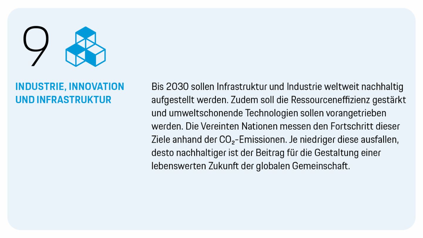 Porsche ermittelt die Menge der CO₂-Emissionen entlang der gesamten Wertschöpfungskette anhand des Dekarbonisierungsindex (DKI) in Tonnen pro Fahrzeug1. Dieser hat sich seit dem definierten Basisjahr 2019 um rund 5 Prozent reduziert (Kapitel „Dekarbonisierung der Fahrzeuge“). So trägt Porsche zu einer nachhaltigen Industrialisierung bei und leistet einen Beitrag zur Erreichung der SDG 9 und 13.