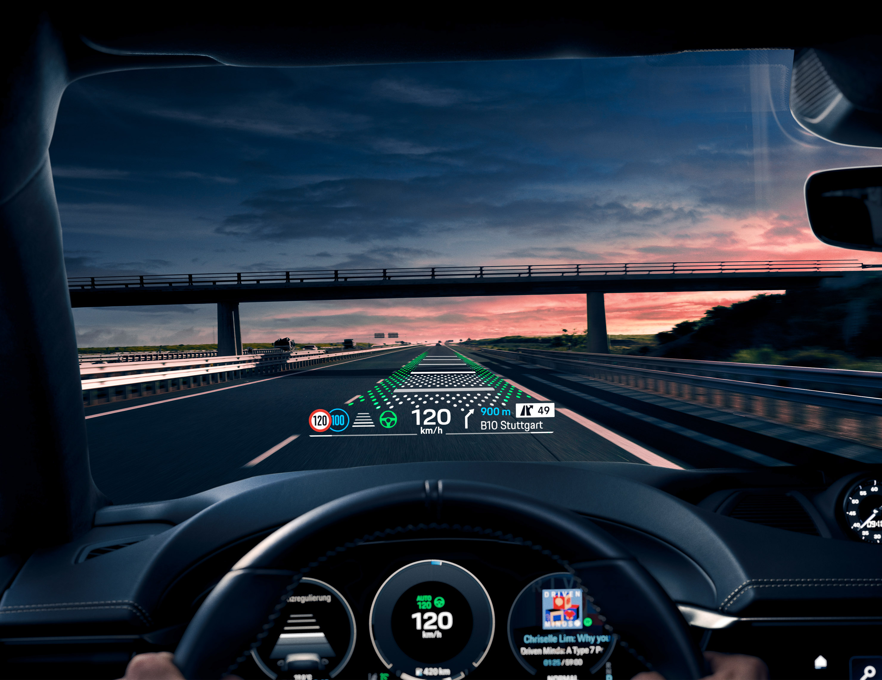 Ein weiteres Software-Highlight ist das neue Android-Betriebssystem. „Wir haben die Porsche-Identität mit ihren vertrauten Bedienelementen weiterentwickelt und um kundenrelevante Inhalte wie Musik- und Videostreaming oder Gaming Apps ergänzt.“ Wer auf bekannte Apps wie Spotify oder YouTube zugreift, landet jetzt in seinem persönlichen Profil, inklusive Playlist und Vorschlägen. Ganz so, wie man es vom Smartphone kennt. Vom Beifahrersitz aus lassen sich zudem auf einem eigenen Screen Lieblingsserien streamen, ohne den Fahrer abzulenken. Wer mag, kann von hier aus bequem die Navigation und Kommandos per Sprachbefehl übernehmen. Apropos: Wer zuerst spricht, hat das Sagen. Array-Mikrofontechnik ordnet Kommandos sitzplatzbezogen zu und vermeidet so Verwirrung. Und mit sechs weiteren neuen Sprachen ist das System so polyglott wie nie zuvor. Das Augmented-Reality-Head-up-Display ist eine zusätzliche Neuheit bei Porsche. Als virtuelles Bild erscheint es mit einer Größe von 87 Zoll in einer Entfernung von zehn Metern vor dem Fahrer. In das reale Bild der Umgebung werden virtuelle Objekte ortsgenau hineinprojiziert. So sind die Informationen zu Navigation und Fahrerassistenzsystemen leichter und schneller erfassbar. Beim Abbiegen etwa schweben virtuelle Navigationspfeile auf Höhe einer Kreuzung und weisen den Weg. Auch Warnhinweise werden unmissverständlich auf tatsächliche Hindernisse projiziert.