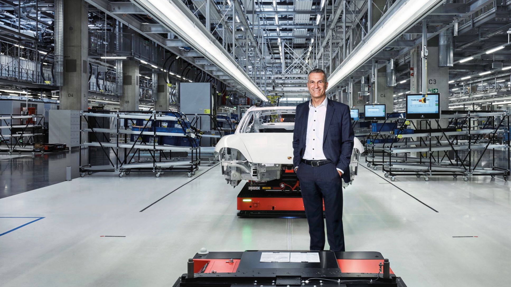 Ja, wir konnten die Taycan-Fertigung von Beginn an komplett neu konzipieren. Das hat den Vorteil, dass wir in Zuffenhausen nun hochinnovative Produktionsstandards etablieren. Den Taycan montieren wir auf einer sogenannten Flexi-Line mit fahrerlosen Transportsystemen, die sich selbstständig von Station zu Station bewegen. Das gibt uns nicht nur neue Freiheiten im Produktionsbetrieb, sondern auch bei der Architektur des neuen Werks. Die Flexi-Line bietet riesige Vorteile in puncto Investitionen und Flexibilität. Durch den Verzicht auf fest im Fundament integrierte Fließbänder sparen wir rund 30 Prozent Investitionskosten. Und ohne das starre Fließband können wir die Fertigung jederzeit modifizieren, Neues integrieren oder einen Bypass fahren, um besondere Kundenwünsche umzusetzen.