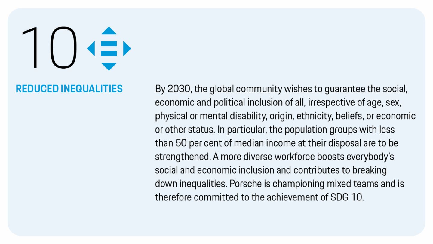 Safeguarding and promoting diversity and equal opportunity are highly important to Porsche and are enshrined as corporate principles. It is a matter of course for Porsche to offer all the employees the same opportunities. The company rejects all forms of discrimination. Porsche is pursuing the goal of establishing an inclusive culture, promoting diversity of views and appreciating people’s differences. This enables the employees to contribute their personalities and develop their personal potential, which encourages appreciative and tolerant interaction and taking a positive approach to different perspectives. This is all geared towards the achievement of a high level of productivity, competitiveness, innovative capacity, creativity and efficiency. The employees’ sense of belonging and communal spirit are to be bolstered at the same time. This is likewise enshrined in the Porsche family’s cultural self-image.
