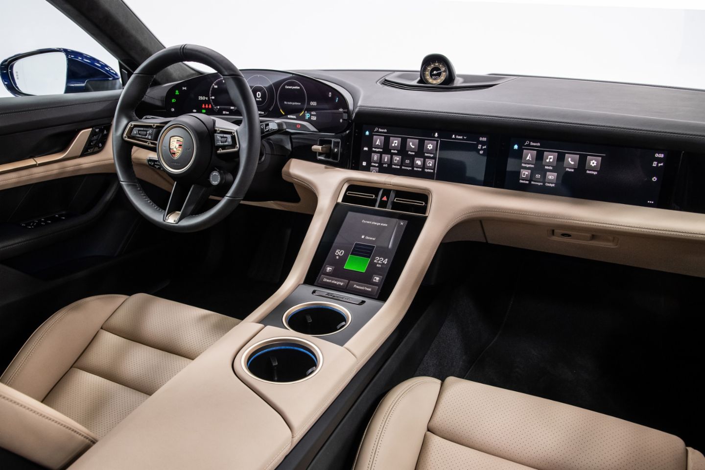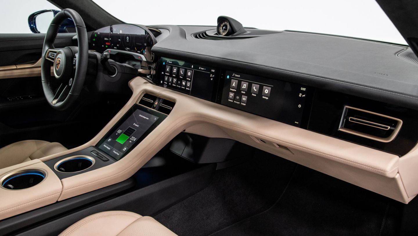 The cockpit signals the start of a new era of interior design at Porsche with its clear structure and a completely new architecture. The free-standing, curved instrument cluster forms the highest point on the dashboard. This places a clear focus on the driver axis. A central, 10.9-inch infotainment display and an optional passenger display are combined to form an integrated glass band in a black-panel look. All user interfaces have been designed from scratch for the Taycan. The number of classic hardware controls such as switches and buttons has been greatly reduced. Instead, control is intelligent and intuitive – using touch operation or the voice control function, which responds to the command “Hey Porsche”.